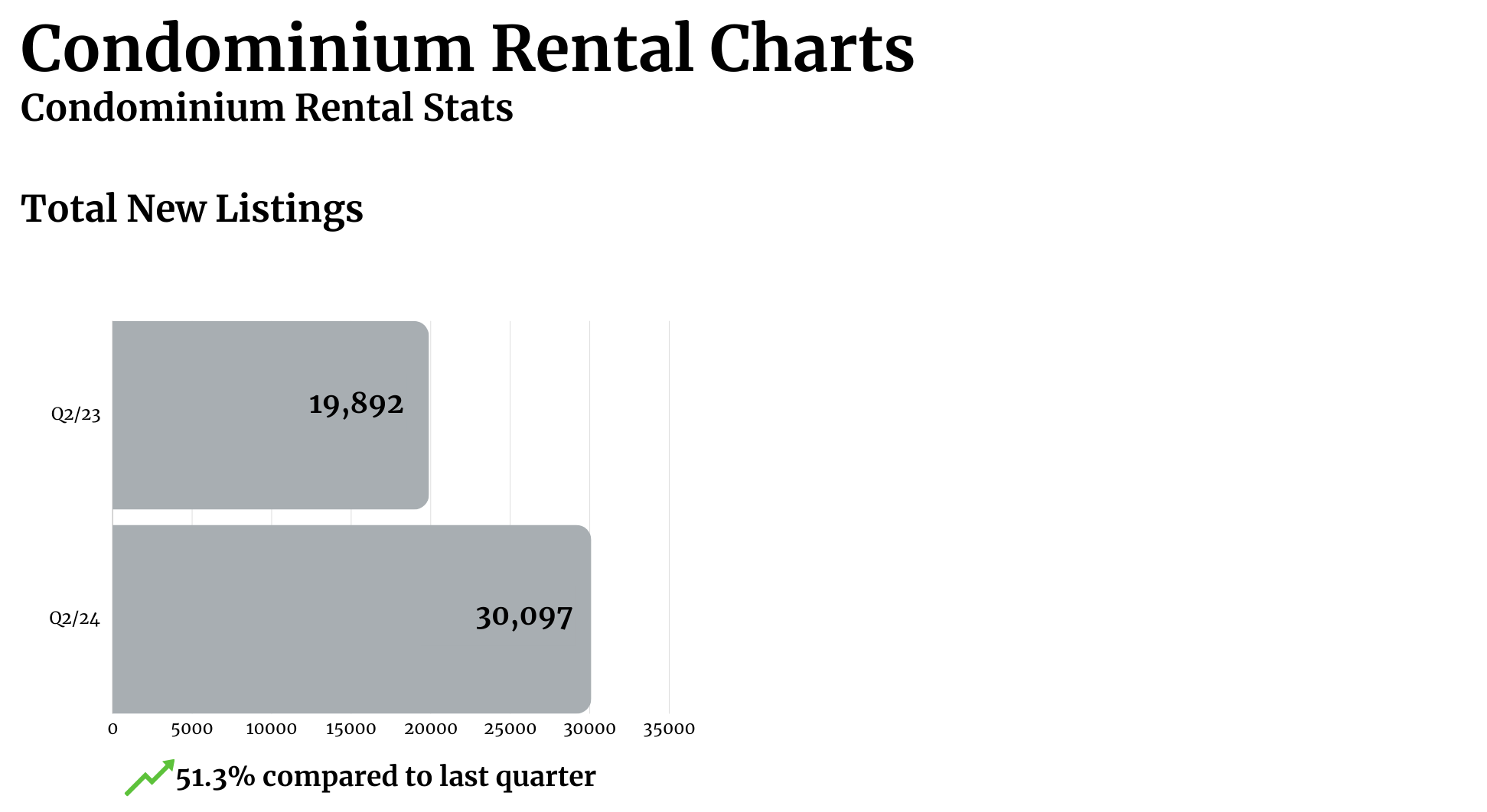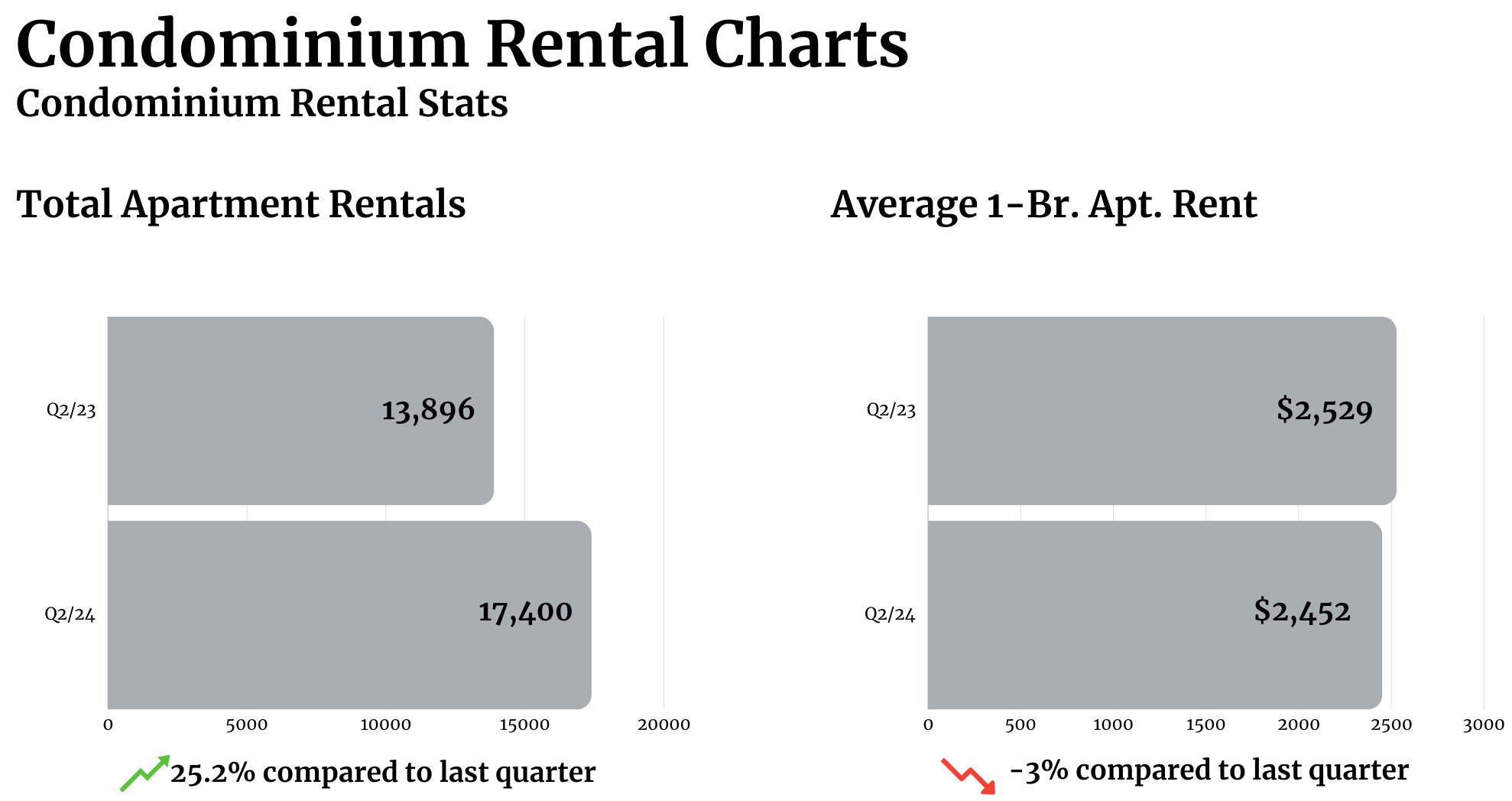 Condo rentals increased a lot in Q2 2024 compared to last year. But with even more listings available, renters had more choices and were able to find lower average rents despite high demand.