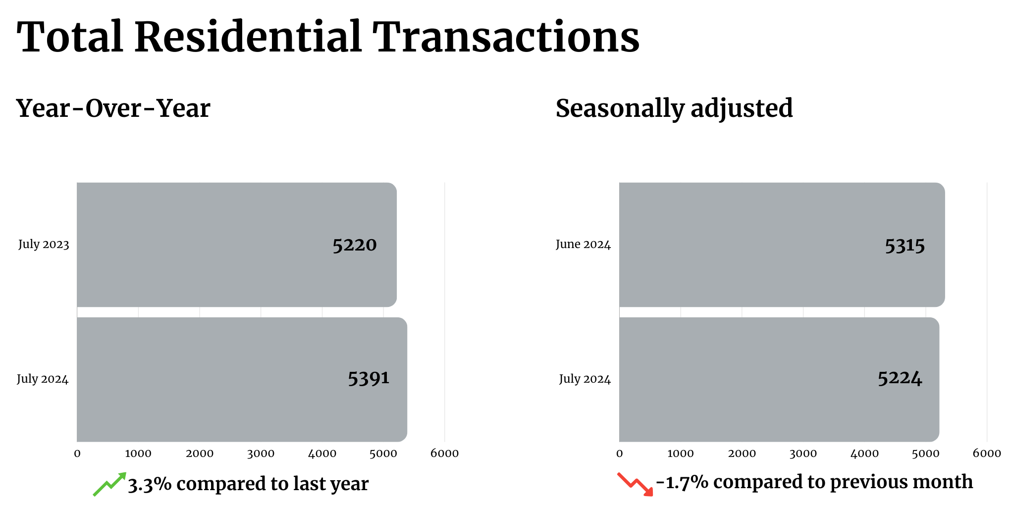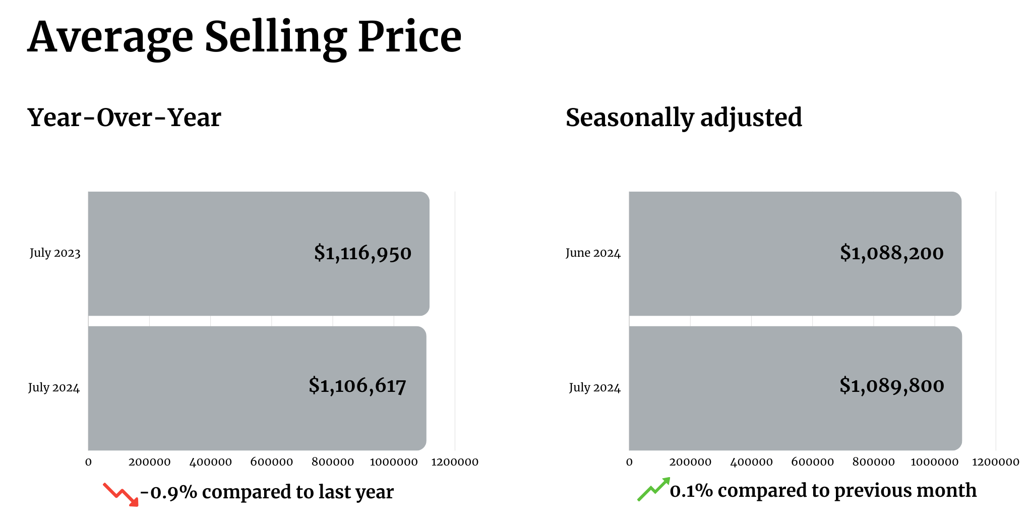 In July 2024, home sales in the GTA saw a 3.3% increase from last year, with 5,391 homes sold. New listings jumped by 18.5%, giving buyers more options and a slight break in prices, with the average selling price down just 0.9% to $1,106,617. The market is showing positive signs, thanks to recent Bank of Canada rate cuts and expected lower borrowing costs, which could lead to even more sales in the coming months. While prices are steady for now, they might start to rise as the current inventory is gradually absorbed.