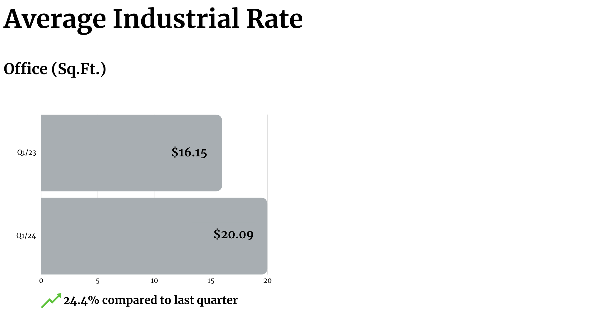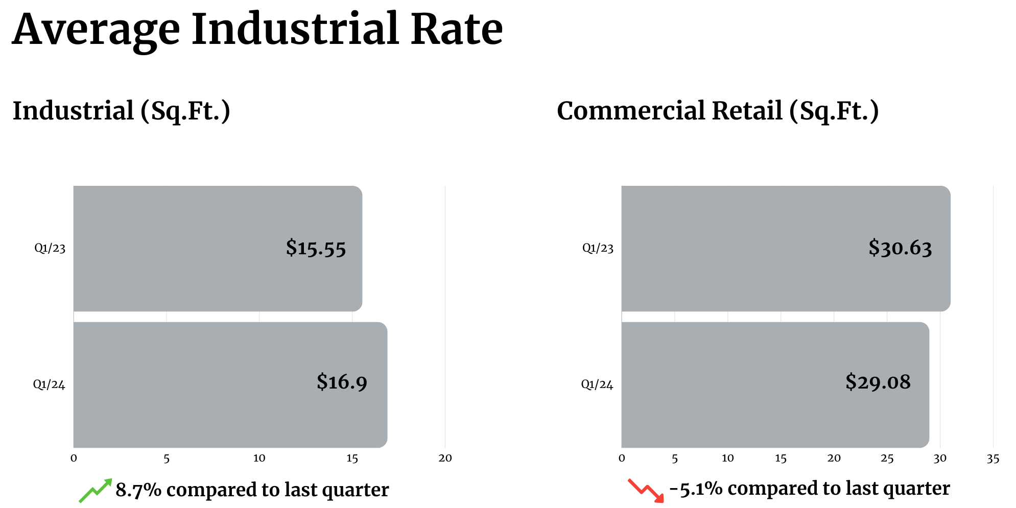 Lease rates rose year-over-year in industrial and office segments, with industrial rates averaging $16.90 per square foot (up from $15.55), and office rates at $20.09 per square foot (up from $16.15). However, commercial/retail rates dipped to $29.08 from $30.63.