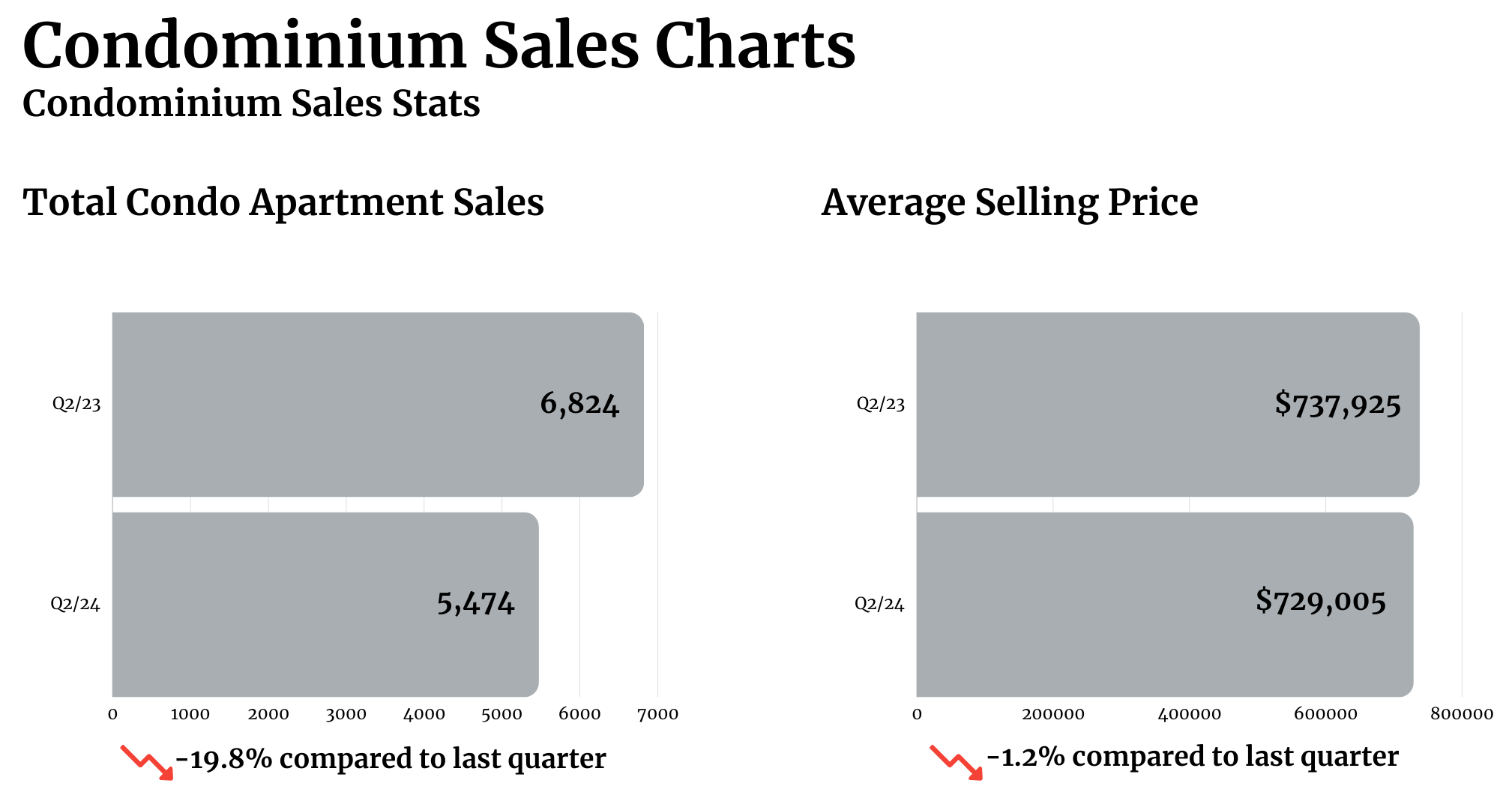 The increase in interest rates and the higher number of condo apartment listings in Q2 2024 led to a noticeable drop in sales compared to last year, although the average selling price held steady.