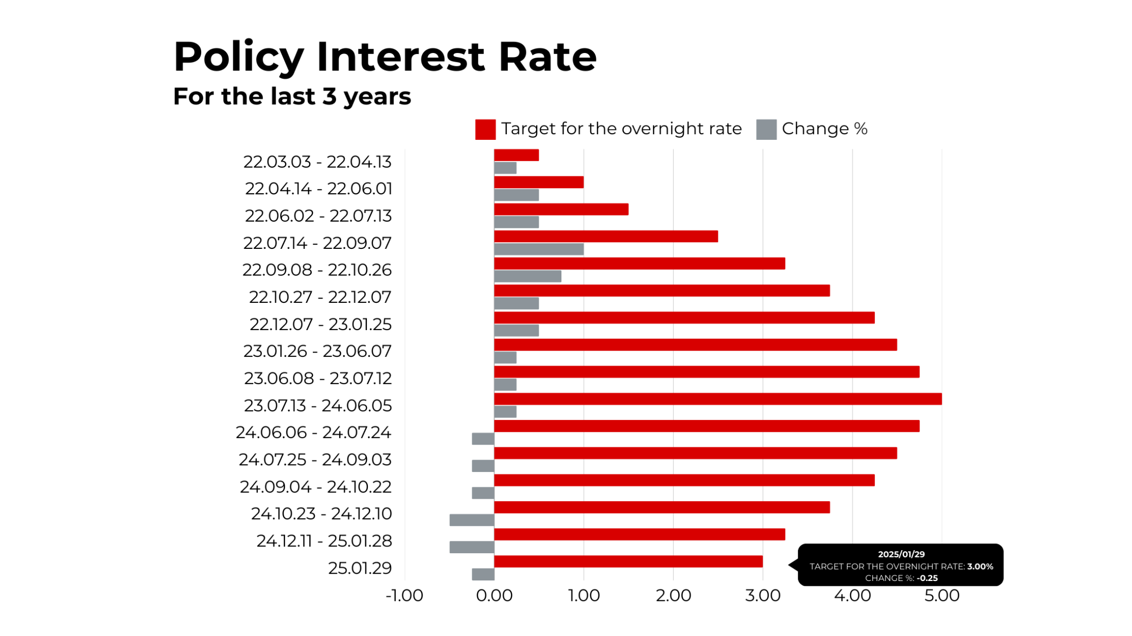 The decision to lower the policy rate comes amid a mix of economic factors. Inflation is hovering around the 2% target, job growth is stabilizing, and consumer spending is picking up. However, business investment remains sluggish, and global trade uncertainties—especially with potential US tariffs—pose risks to Canada’s economic outlook.