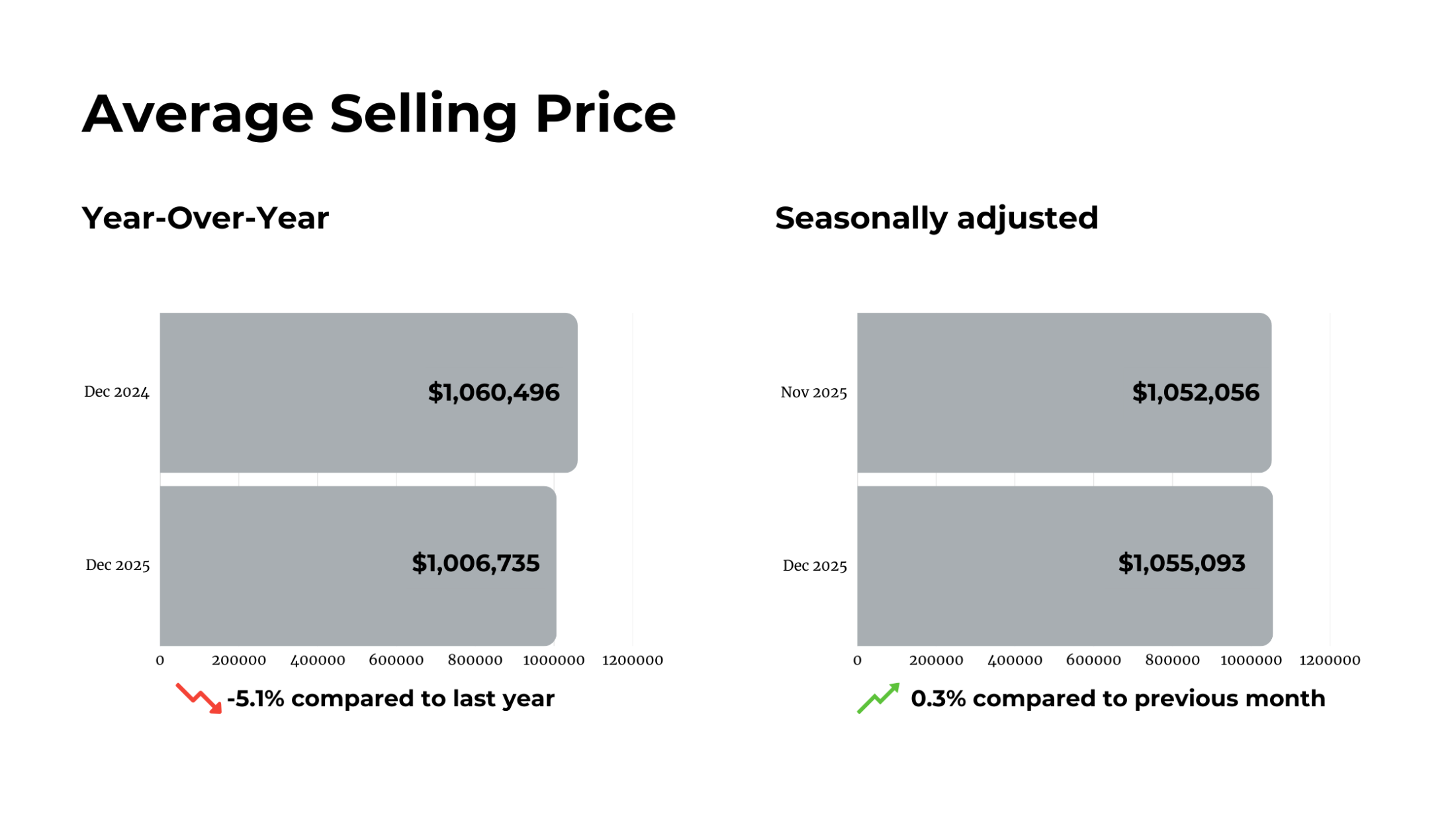 Annual home sales finished 11.2% lower than in 2024, while the average selling price for the year settled at $1,067,968—a 4.7% decrease that has helped many households find a more accessible entry point. In December specifically, the average price landed at $1,006,735. While this is lower than last year, when seasonally adjusted prices actually edged upward compared to November, signaling that the market floor has likely been established.