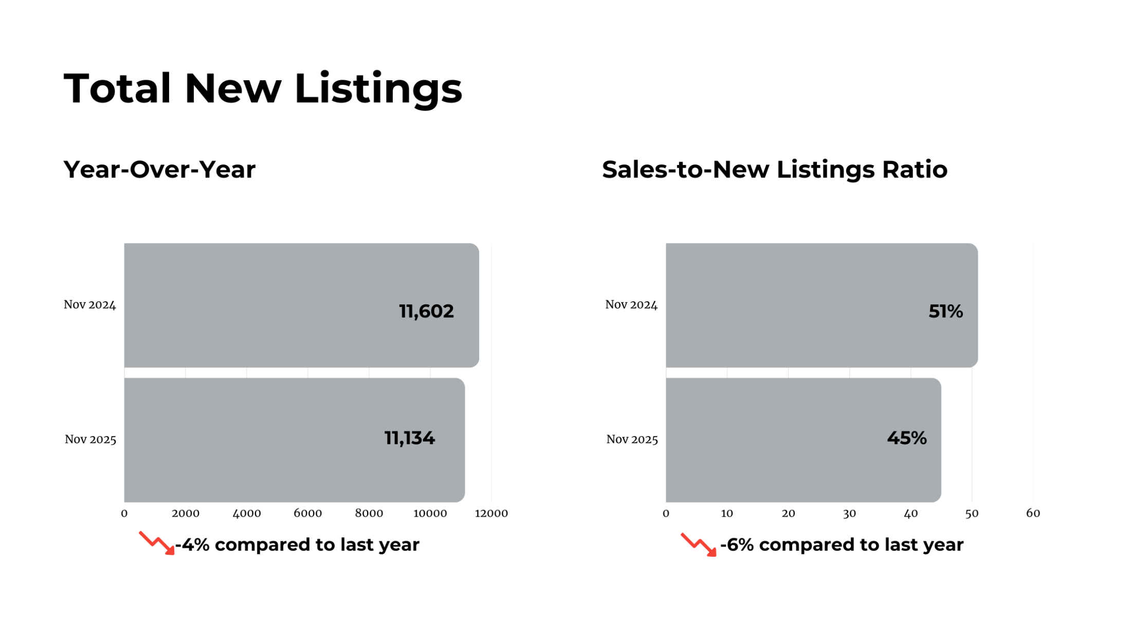 Home sales fell 15.8% year-over-year, while new listings dipped by 4%. The average selling price declined to $1,039,458, down 6.4% annually. Despite the softer numbers, month-to-month indicators show stability: prices held steady, and the average home price even edged up slightly from October.