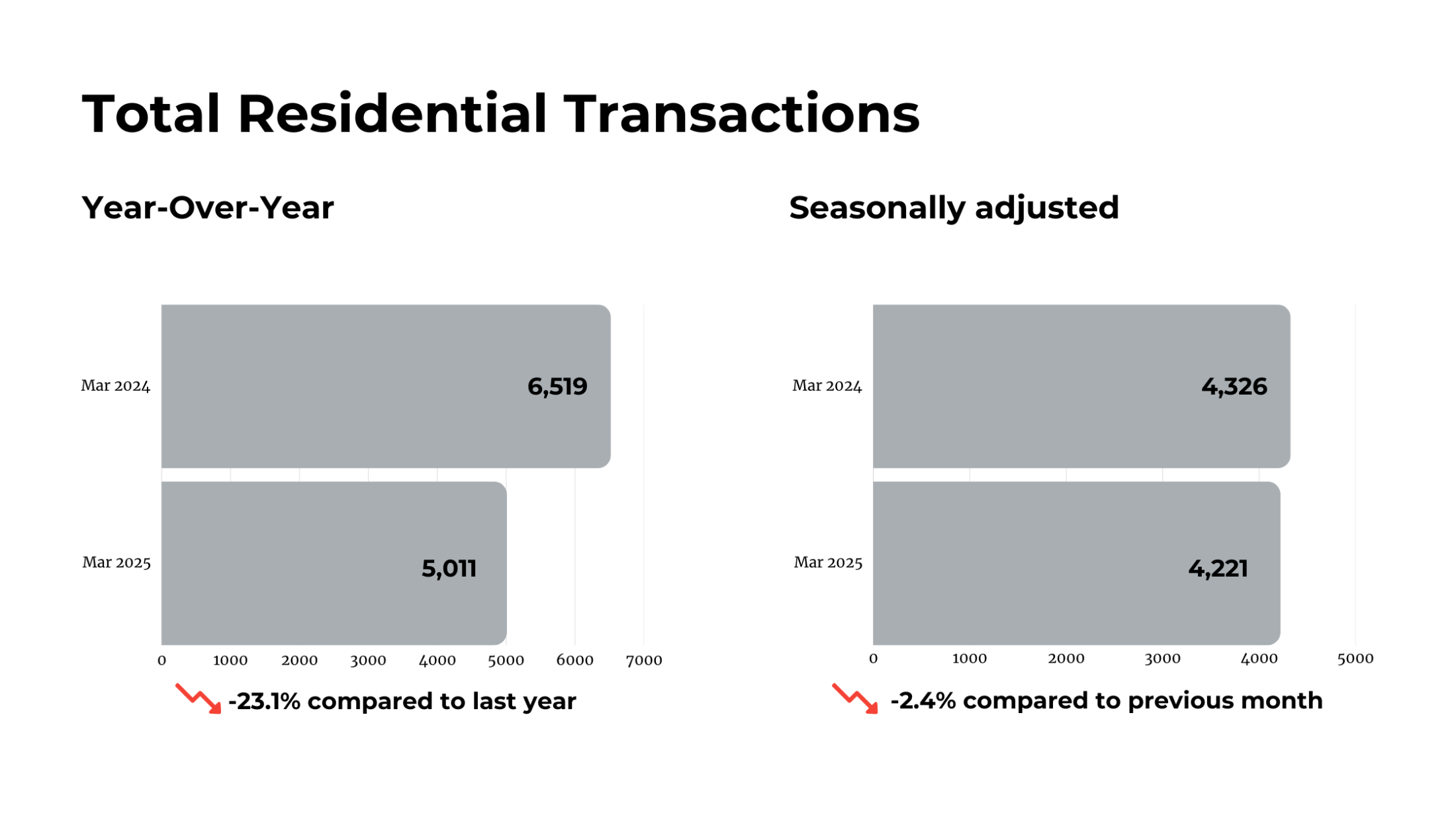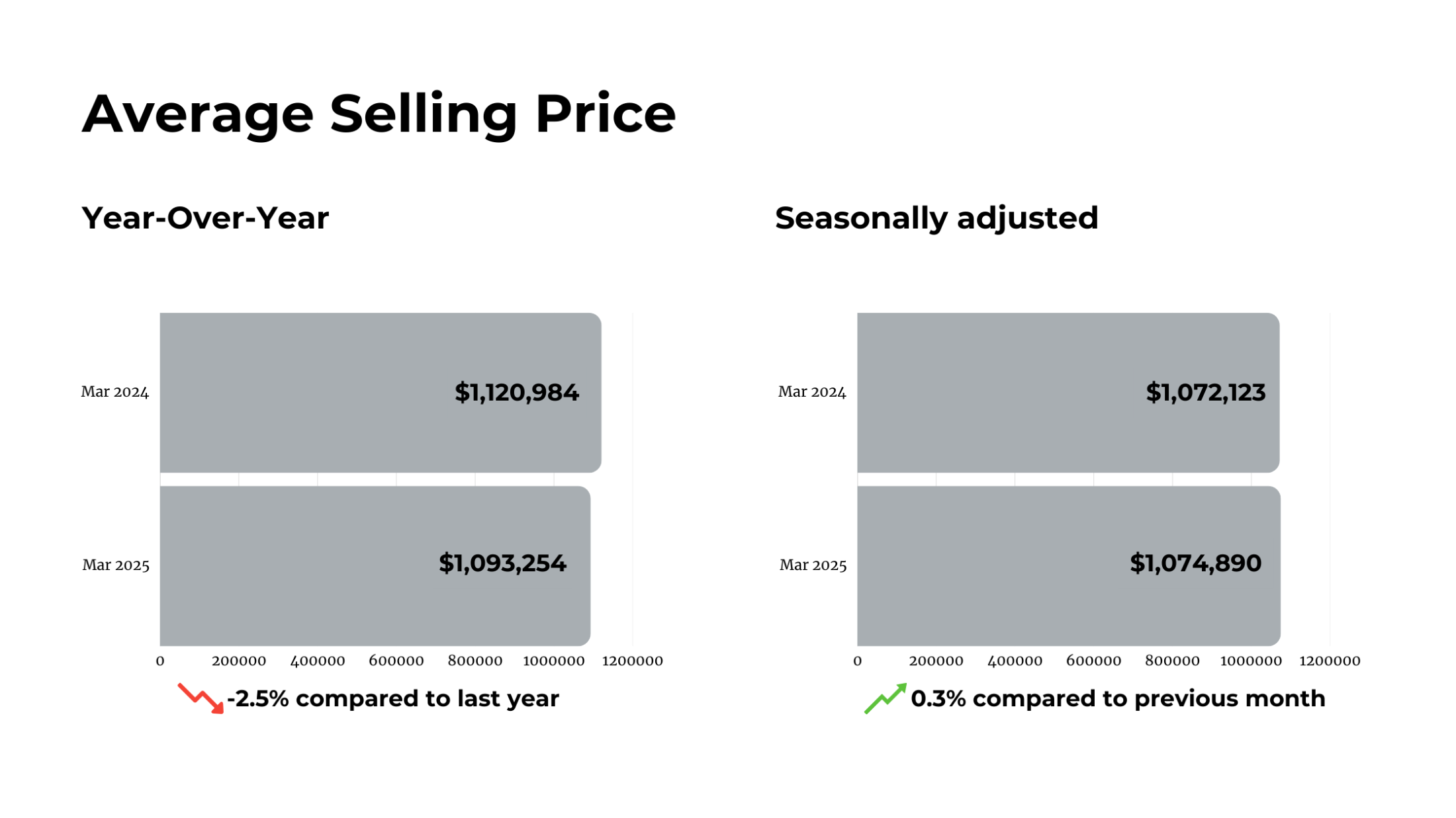 March 2025 saw a continued shift toward buyer advantage in the GTA real estate market. Home sales dropped 23.1% compared to last year, while new listings surged by 28.6%, giving buyers more choice and negotiation power. The average selling price came in at $1.09M, down 2.5% year-over-year, with the MLS® HPI benchmark also down 3.8%.