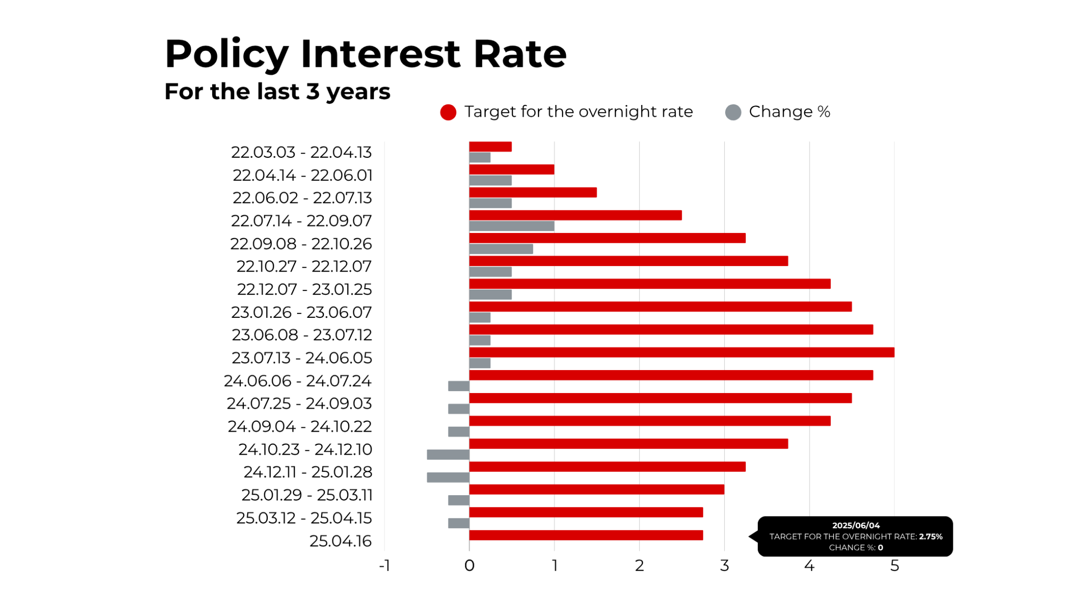 On October 29, 2025, the Bank of Canada lowered its target for the overnight rate by 25 basis points to 2.25%.